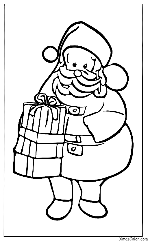 Père Noël porte une tenue rouge et verte. Il a un sac de cadeaux.
