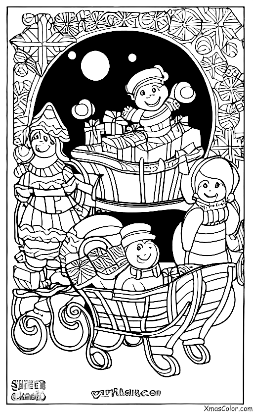 Le traîneau est rempli de cadeaux. Les rennes sont prêts à le tirer.
